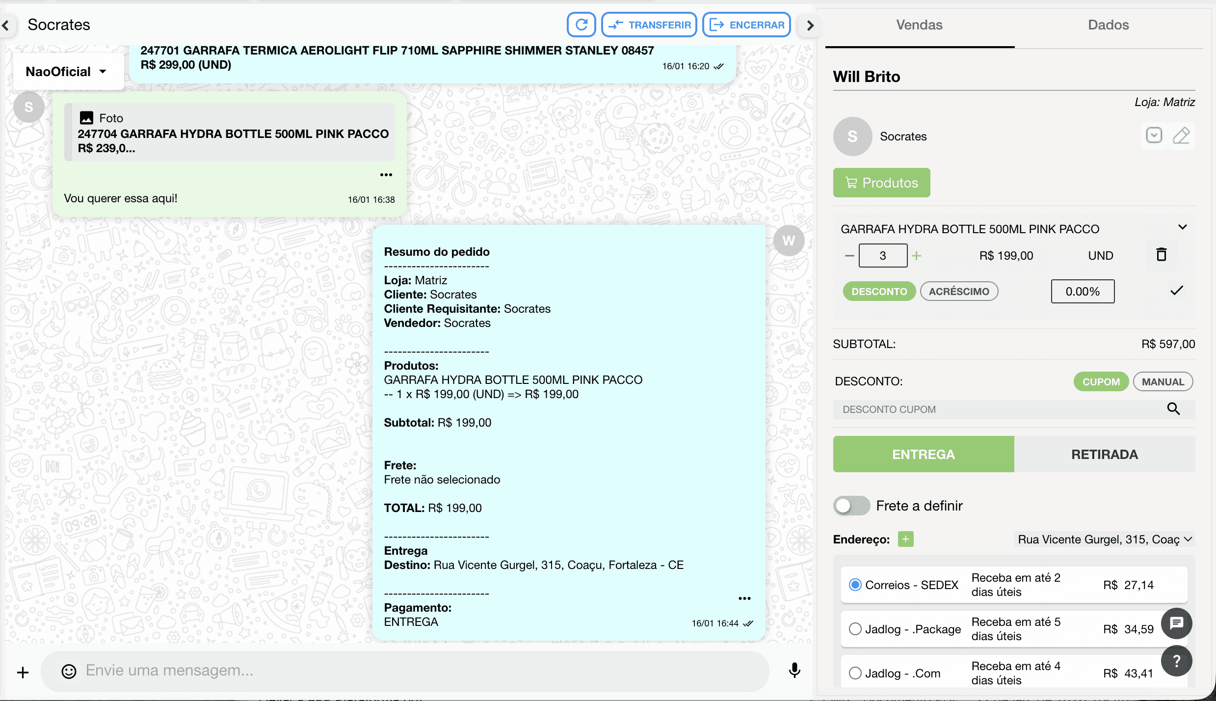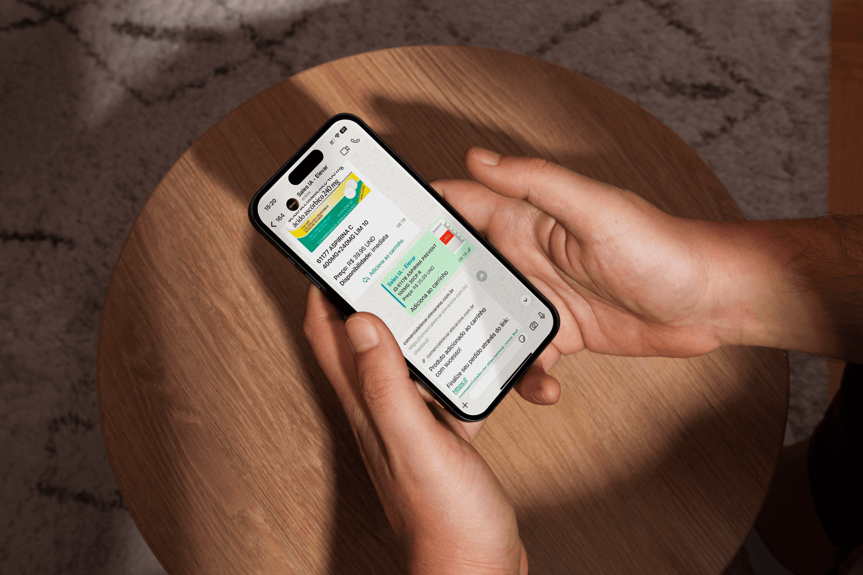 Todo o processo acontece dentro da conversa: consulta de estoque, definição de frete e pagamento, geração de pedidos e link de pagamento, tudo em uma única tela.